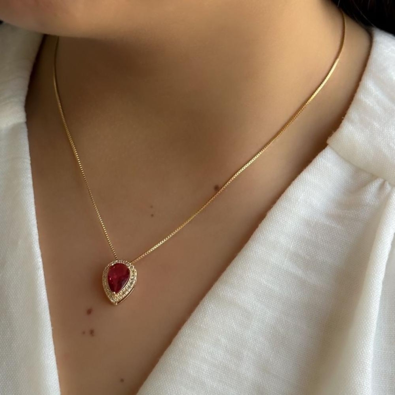 Colar Gota Vermelha Cravejada em OuroConfira opiniões e avaliações de clientes!